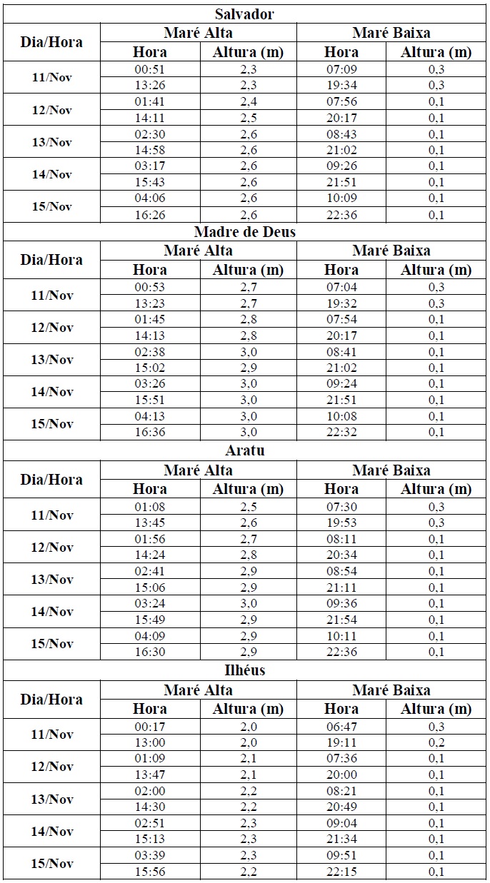 Para o período entre os dias 11/11 (sexta-feira) e 15/11/2016 (terça-feira), a maré deverá atingir sua altura máxima no período entre à 00h30min e às 04h30min e entre às 12h30min e às 16h30min com valores variando de 2,0 a 3,0 metros. Já as alturas mínimas deverão ser registradas no período entre às 06h30min e às 10h30min e entre às 18h30min e às 22h30min, com valores variando de 0,1 a 0,3 metro. As ondas previstas deverão ter agitação fraca, com altura máxima podendo chegar a 2,0 metros.
