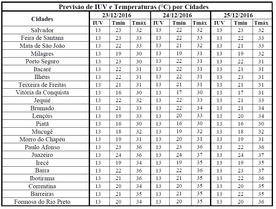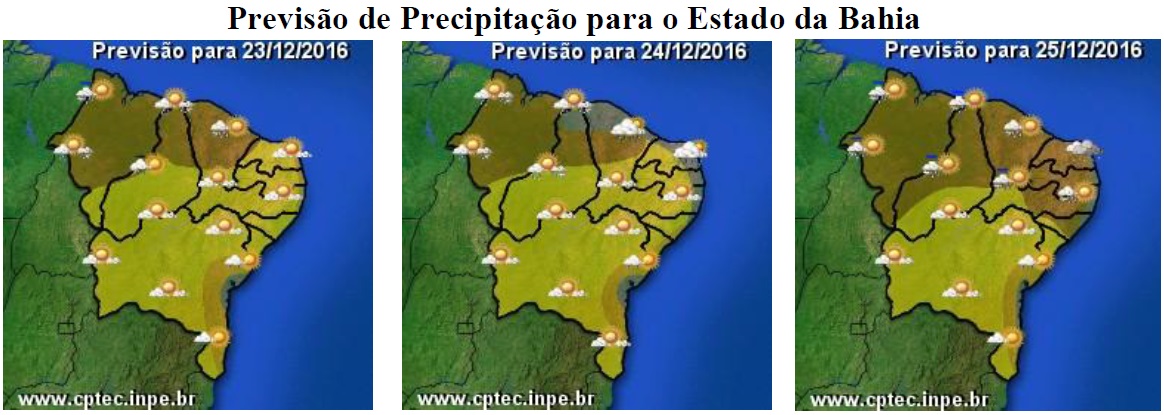 Para os próximos dias na Bahia, incluindo o final de semana natalino, não são esperadas mudanças significativas nas condições do tempo, pois a massa de ar quente e seco continua ganhando força, o que deverá reduzir a nebulosidade e as chances de chuvas em, praticamente, todo o Estado. Além de deixar o tempo seco, a atuação dessa massa de ar também está contribuindo para elevar as temperaturas em todas as regiões, no entanto os maiores índices, com máximas variando de 34°C a 37°C, continuam sendo esperados para o Oeste, São Francisco, Norte e Nordeste. Mesmo assim, em algumas localidades serão registradas temperaturas mais amenas, a exemplo das áreas serranas da Chapada Diamantina e Sudoeste, onde as mínimas poderão chegar aos 16°C.
