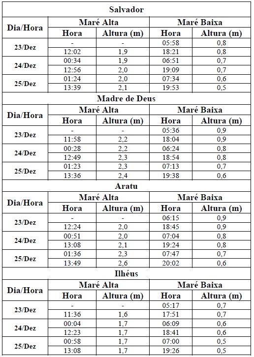 Entre os dias 23/12 (sexta-feira) e 25/12/2016 (domingo), a maré deverá atingir sua altura máxima no período entre à 00h00min e às 02h00min e entre às 12h00min e às 14h00min, com valores variando de 1,6 a 2,6 metros. Já as alturas mínimas deverão ser registradas no período entre às 05h00min e às 08h00min e entre às 17h00min e às 20h00min, com valores variando de 0,5 a 0,9 metro. As ondas previstas deverão ter agitação fraca, com altura máxima podendo chegar a 2,0 metros.