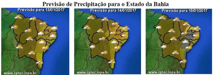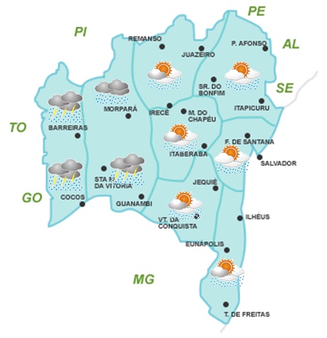 Nas regiões da Chapada Diamantina e Norte, onde as temperaturas se manterão elevadas, também há previsão de chuvas, porém, com menor intensidade. Já no Sul e Sudoeste do Estado, quem poderá influenciar com mais intensidade é a frente fria, principalmente, a partir do dia 14 (sábado), quando o predomínio será de céu encoberto e chuvoso.
