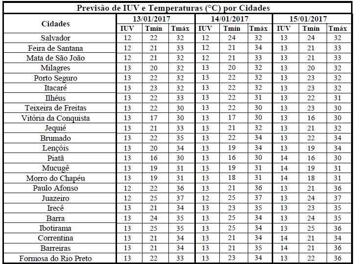 Com a chegada do verão, as temperaturas se elevam e as chuvas ficam mais intensas. Com isso, o aumento da nebulosidade reduz a incidência de radiação solar e, consequentemente, nos Índices de Radiação Ultravioleta (IUV's). Tal redução pode ser vista na previsão para o período entre os dias 13/01 (sexta-feira) e 15/01/2017 (domingo), quando os IUV's deverão variara de 12 a 14, o que, segundo a Organização Mundial de Saúde (OMS), fazem parte da categoria de intensidade “Extrema”. Com isso, os cuidados quanto à exposição prolongada à radiação solar deverão ser redobrados, principalmente, nos horários das 10 às 16h quando há maior incidência dessa radiação. Assim, recomenda-se a utilização de protetor/filtro solar, chapéus, bonés, óculos escuros e roupas leves, o que poderá minimizar os danos causados a saúde.