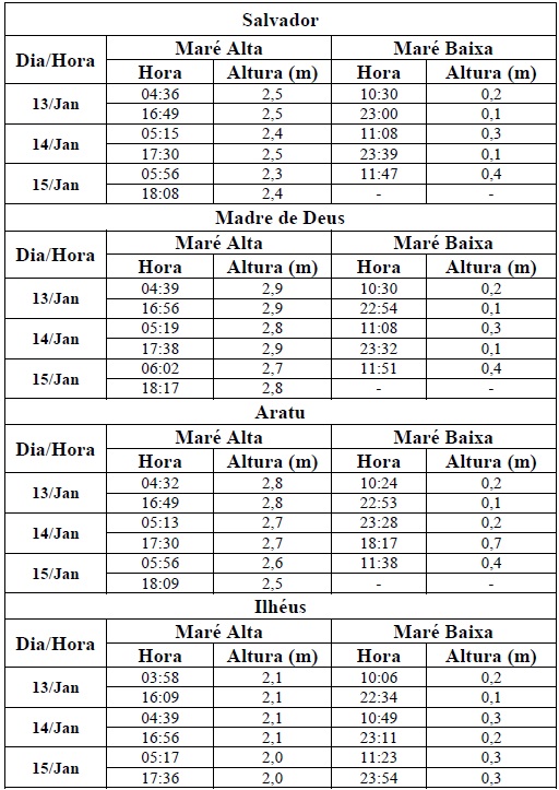 Entre os dias 13/01 (sexta-feira) e 15/01/2017 (domingo), a maré deverá atingir sua altura máxima no período entre às 04h00min e às 06h00min e entre às 16h00min e às 18h00min, com valores variando de 2,1 a 2,8 metros. Já as alturas mínimas deverão ser registradas no período entre às 10h00min e às 12h00min e entre às 22h00min e às 24h00min, com valores variando de 0,1 a 0,7 metro. As ondas previstas deverão ter agitação fraca, com altura máxima podendo chegar a 1,5 metro.
