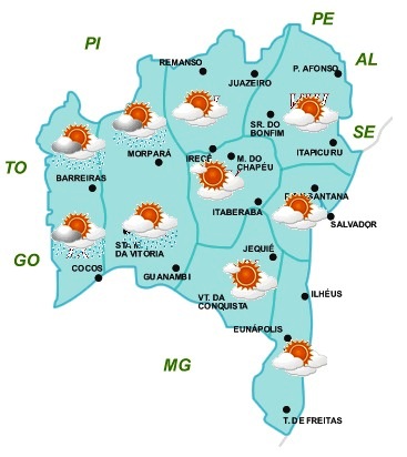 Em relação às temperaturas, os maiores índices ainda deverão ser registrados na faixa centro-oeste e norte, onde poderão atingir os 37°C em algumas localidades. Na faixa litorânea, essas máximas deverão variar entre 30°C e 34°C. Mesmo com essa previsão de tempo quente, ainda são esperadas temperaturas mais amenas nas áreas serranas da Chapada Diamantina e Sudoeste, onde as mínimas poderão chegar aos 16°C.