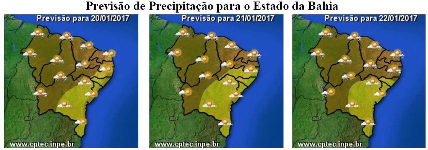 As chuvas previstas para os próximos dias na Bahia, que inclui o final de semana, permanecem restritas a duas áreas do Estado. Uma dessas áreas é a faixa centro-oeste, onde, devido os altos índices de umidade e temperaturas, são esperados os maiores volumes dessas chuvas, sobretudo no Oeste e São Francisco. Já na faixa leste é a umidade trazida pelos ventos vindos do Oceano Atlântico que, juntamente ao calor (típico a época do ano), favorecerão a ocorrência de chuvas fracas e isoladas, principalmente na faixa litorânea.