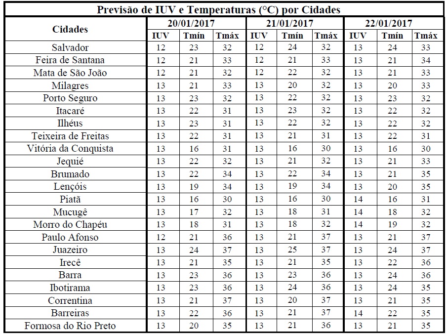 Com a chegada do verão, as temperaturas se elevam e as chuvas ficam mais intensas. Com isso, o aumento da nebulosidade reduz a incidência de radiação solar e, consequentemente, nos Índices de Radiação Ultravioleta (IUV's). Tal redução pode ser vista na previsão para o período entre os dias 20/01 (sexta-feira) e 22/01/2017 (domingo), quando os IUV's deverão variara de 12 a 14, o que, segundo a Organização Mundial de Saúde (OMS), fazem parte da categoria de intensidade “Extrema”. Com isso, os cuidados quanto à exposição prolongada à radiação solar deverão ser redobrados, principalmente, nos horários das 10 às 16 horas quando há maior incidência dessa radiação. Assim, recomenda-se a utilização de protetor/filtro solar, chapéus, bonés, óculos escuros e roupas leves, o que poderá minimizar os danos causados a saúde.