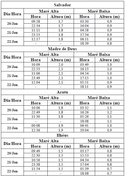 Entre os dias 20/01 (sexta-feira) e 22/01/2017 (domingo), a maré deverá atingir sua altura máxima no período entre às 10h30min e às 13h30min e entre às 22h30min e às 01h30min, com valores variando de 1,6 a 2,7 metros. Já as alturas mínimas deverão ser registradas no período entre às 04h30min e às 07h30min e entre às 16h30min e às 19h30min, com valores variando de 0,1 a 0,8 metro. As ondas previstas deverão ter agitação fraca, com altura máxima podendo chegar a 1,5 metro.