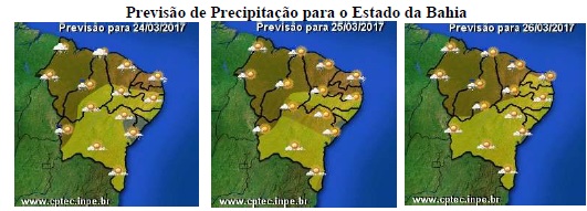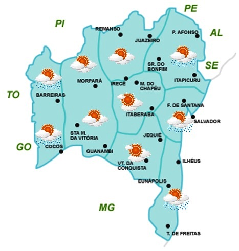 Apesar de chuvas previstas para algumas regiões, as temperaturas se manterão elevadas em, praticamente todo o Estado. Os maiores índices ainda estão previstos para o centro-norte e oeste do Estado, onde as máximas deverão variar de 32°C a 36°C. Por outro lado, temperaturas mais amenas são esperadas para as áreas serranas da Chapada Diamantina e Sudoeste, onde as mínimas podem chegar aos 16°C.
