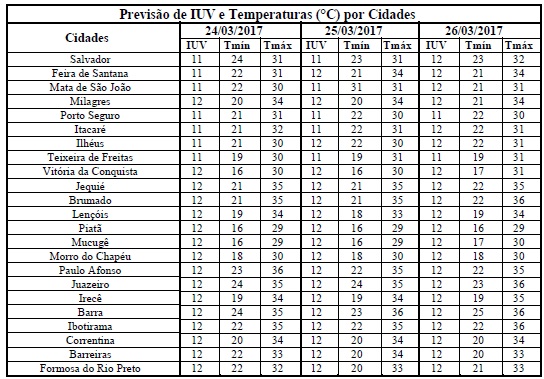 O início do outono se mantém com característica de verão, com altas temperaturas, chuvas mais intensas e aumento da incidência de radiação solar e, consequentemente, dos Índices de Radiação Ultravioleta (IUV's). Tal situação pode ser vista na previsão para o período entre os dias 24 e 26/03 quando estes deverão variar de 11 a 12 em todo o Estado. De acordo com a Organização Mundial de Saúde (OMS), estes IUV's fazem parte da categoria de intensidade “Extrema”, o que requer cuidados quanto à exposição prolongada à radiação solar, principalmente, nos horários das 10 às 16 horas, quando há maior incidência dessa radiação. Com isso, para minimizar os danos causados a saúde, recomenda-se a utilização de protetor/filtro solar, chapéus, bonés, óculos escuros e roupas leves, etc.