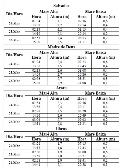 Entre os dias 24/03 (sexta-feira) e 26/03/2017 (domingo), a maré deverá atingir sua altura máxima no período entre às 01h00min e às 03h00min e entre às 13h00min e às 15h00min, com valores variando de 1,7 a 2,9 metros. Já as alturas mínimas deverão ser registradas no período entre à 07h00min e às 10h00min e entre às 19h00min e às 21h00min, com valores variando de 0,5 a 0,6 metro. As ondas previstas deverão ter agitação fraca a moderada, com altura máxima podendo chegar a 2,0 metro.