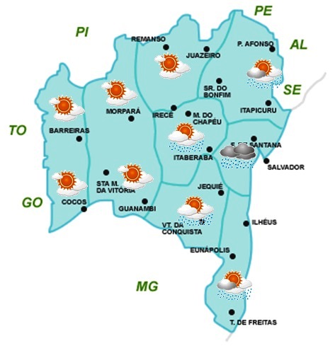 Na faixa centro-oeste e norte, que inclui as regiões Oeste, São Francisco, Norte e parte da Chapada Diamantina e Sudoeste, quem continua predominando é uma massa de ar quente e seco, pois mesmo enfraquecida ainda deverá manter o céu com poucas nuvens e sem chuvas na maior parte do período.
