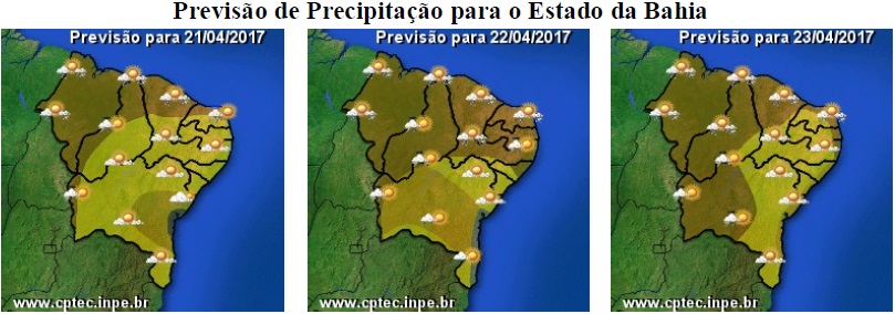 As condições do tempo previstas para os próximos dias na Bahia, que inclui o final de semana prolongado, devido ao feriado de Tiradentes, deverão ser influenciadas por sistemas meteorológicos de diferentes características e em áreas distintas.