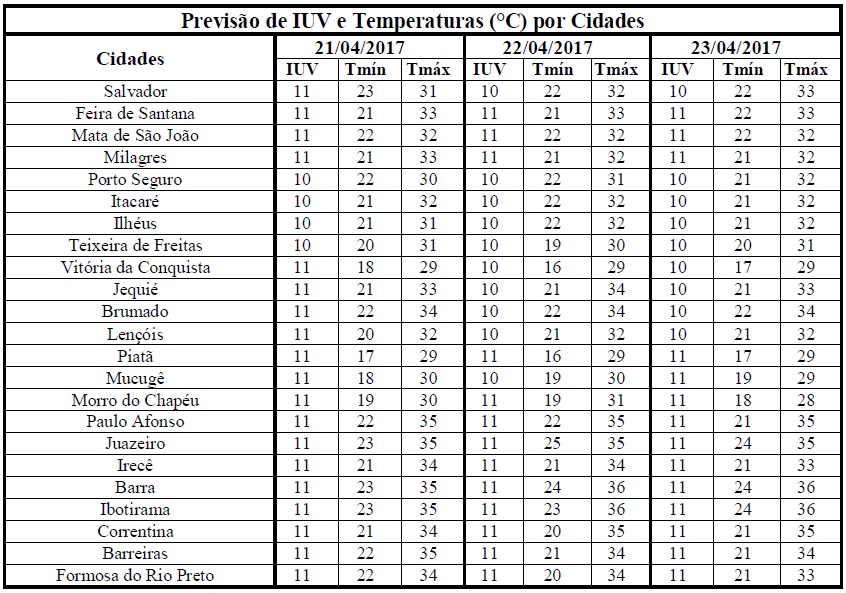 O início do outono apresenta características semelhantes a do verão, ou seja, com temperaturas elevadas e chuvas mais intensas, além do aumento da incidência de radiação solar e, consequentemente, dos Índices de Radiação Ultravioleta (IUV's). Tal situação pode ser vista na previsão para o período entre os dias 21 e 23/04 (sexta-feira a domingo) quando estes deverão variar de 10 a 11 em todo o Estado. De acordo com a Organização Mundial de Saúde (OMS), estes IUV's fazem parte das categorias de intensidade “Muito Alta e Extrema”, o que requer cuidados quanto à exposição prolongada à radiação solar, principalmente, nos horários das 10 às 16 horas, quando há maior incidência dessa radiação. Com isso, para minimizar os danos causados a saúde, recomenda-se a utilização de protetor/filtro solar, chapéus, bonés, óculos escuros e roupas leves, etc.