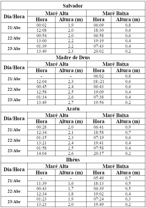 Entre os dias 21/04 (sexta-feira) e 23/04/2017 (domingo), a maré deverá atingir sua altura máxima no período entre à 00h00min e às 02h00min e entre às 12h00min e às 14h00min, com valores variando de 1,6 a 2,7 metros. Já as alturas mínimas deverão ser registradas no período entre às 06h00min e às 08h00min e entre às 18h00min e às 20h00min, com valores variando de 0,2 a 0,9 metro. As ondas previstas deverão ter agitação de moderada a fraca, com altura máxima podendo chegar aos 2,0 metros.