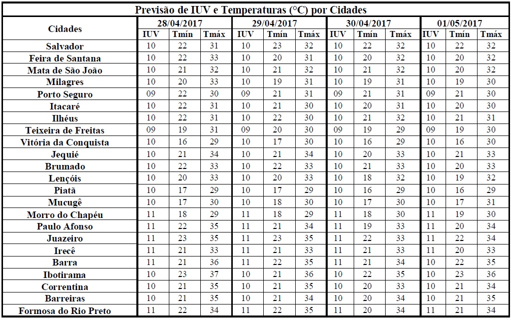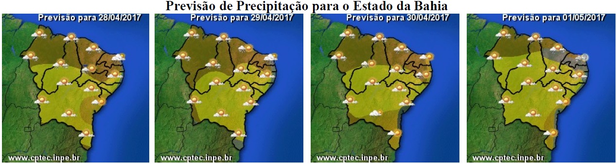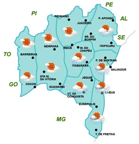 As condições do tempo na Bahia, previstas para os próximos dias, que inclui o final de semana prolongado, devido ao feriado de 1° de maio, deverão ser influenciadas por sistemas meteorológicos de diferentes características e em áreas distintas.