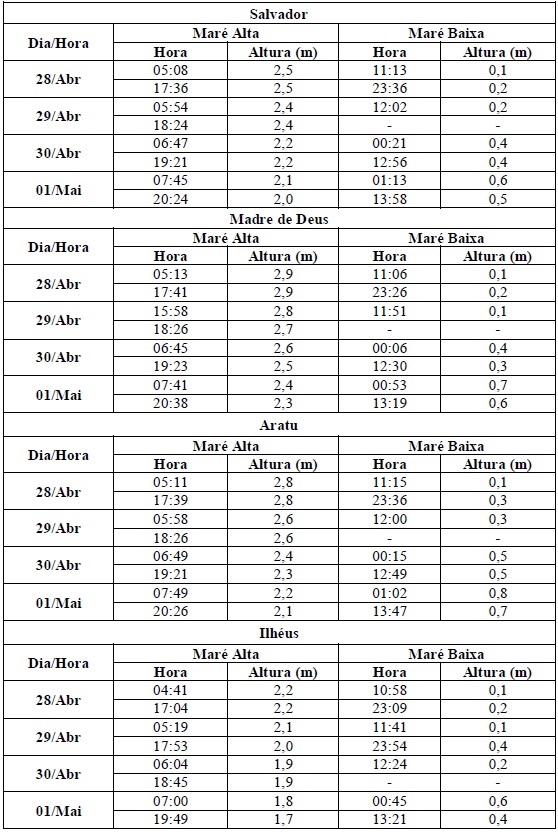Entre os dias 28/04 (sexta-feira) e 01/05/2017 (segunda-feira), a maré deverá atingir sua altura máxima no período entre às 04h30min e às 07h30min e entre às 16h30min e às 19h30min, com valores variando de 1,7 a 2,9 metros. Já as alturas mínimas deverão ser registradas no período entre às 22h30min e à 01h30min (do dia seguinte) e entre às 10h30min e às 13h30min, com valores variando de 0,1 a 0,8 metro. As ondas previstas deverão ter agitação de moderada a fraca, com altura máxima podendo chegar aos 2,0 metros.