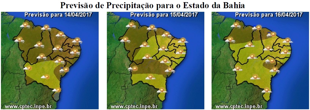 As condições do tempo previstas para os próximos dias na Bahia, que inclui o final de semana prolongado, devido ao feriado da sexta-feira santa, continuam sendo de algumas mudanças, principalmente em relação às chuvas, pois mesmo com a atuação da massa de ar quente e seco, a Zona de Convergência Intertropical (ZCIT) ainda poderá contribuir para a ocorrência de chuvas fracas em algumas localidades, sobretudo na região Norte e na faixa centro-norte das regiões Oeste e São Francisco.