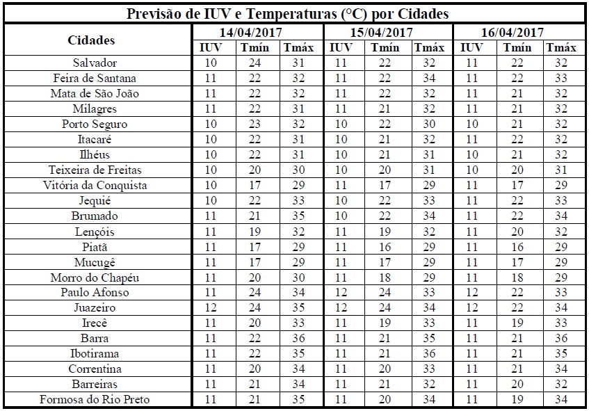 O início do outono apresenta características semelhantes a do verão, ou seja, com temperaturas elevadas e chuvas mais intensas, além do aumento da incidência de radiação solar e, consequentemente, dos Índices de Radiação Ultravioleta (IUV's). Tal situação pode ser vista na previsão para o período entre os dias 14 e 16/04 (sexta-feira a domingo) quando estes deverão variar de 10 a 12 em todo o Estado. De acordo com a Organização Mundial de Saúde (OMS), estes IUV's fazem parte das categorias de intensidade “Muito Alta e Extrema”, o que requer cuidados quanto à exposição prolongada à radiação solar, principalmente, nos horários das 10 às 16 horas, quando há maior incidência dessa radiação. Com isso, para minimizar os danos causados a saúde, recomenda-se a utilização de protetor/filtro solar, chapéus, bonés, óculos escuros e roupas leves, etc.