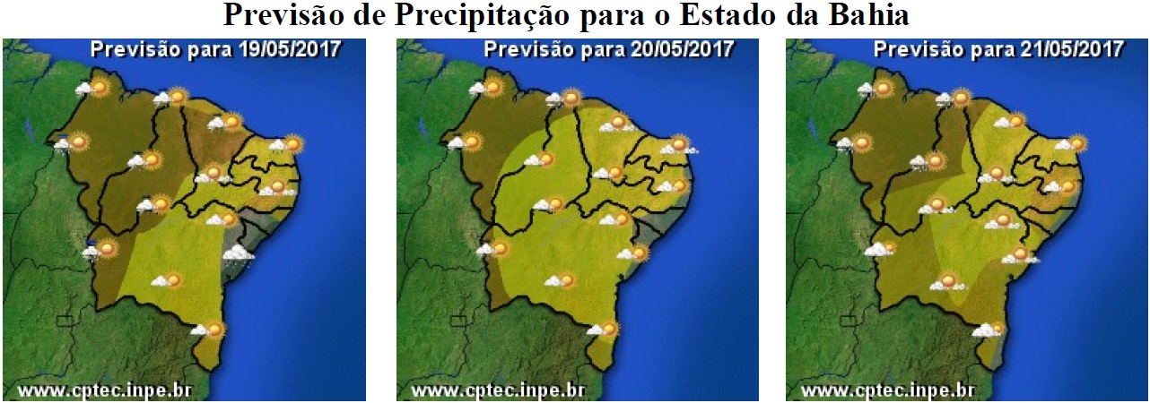 Para os próximos dias, que inclui o final de semana, o tempo na Bahia continua com algumas mudanças, principalmente em relação às chuvas, pois a massa de ar quente e seco segue enfraquecendo, o que poderá favorecer o aumento da nebulosidade e, consequentemente, das chuvas em grande parte do Estado. No entanto, é na faixa centro-leste, sobretudo nas regiões do Recôncavo, Sul, Nordeste, Sudoeste e Chapada Diamantina onde as chances de ocorrência dessas chuvas serão maiores.