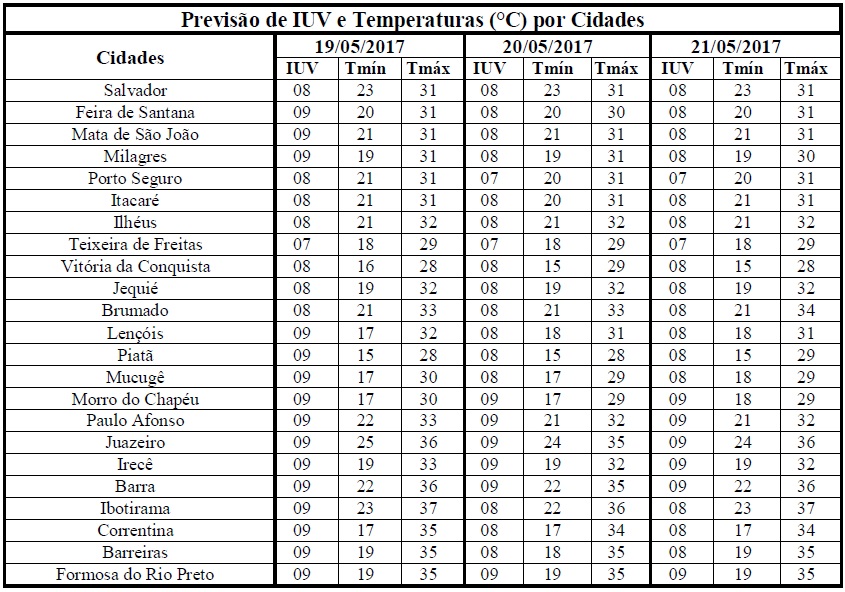 Na segunda metade do outono as características da estação se assemelham as características do inverno, ou seja, com temperaturas mais amenas e chuvas de fraca intensidade, mas de longa duração. Também nesse período, há uma redução na incidência de radiação solar e, consequentemente, dos Índices de Radiação Ultravioleta (IUV's). Ainda assim, estes índices continuam elevados, a exemplo dos que estão previstos para o período entre os dias 19/05 (sexta-feira) e 21/05 (domingo), quando deverão variar de 07 a 09 em todo o Estado. De acordo com a Organização Mundial de Saúde (OMS), estes IUV's fazem parte das categorias de intensidade “Alta e Muito Alta”, o que requer cuidados quanto à exposição prolongada à radiação solar, principalmente, nos horários das 10 às 16 horas, quando há maior incidência dessa radiação. Com isso, para minimizar os danos causados a saúde, recomenda-se a utilização de protetor/filtro solar, chapéus, bonés, óculos escuros e roupas leves, etc.