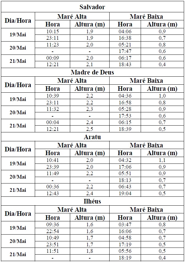 Entre os dias 19/05 (sexta-feira) e 21/05/2017 (domingo), a maré deverá atingir sua altura máxima no período entre às 22h00min (do dia anterior) e à 01h00min (do dia seguinte) e entre às 10h00min e às 13h00min, com valores variando de 1,6 a 2,5 metros. Já as alturas mínimas deverão ser registradas no período entre às 04h00min e às 07h00min e entre às 16h00min e às 19h00min, com valores variando de 0,4 a 1,1 metro. As ondas previstas deverão ter agitação de moderada a fraca, com altura máxima podendo chegar aos 2,5 metros.