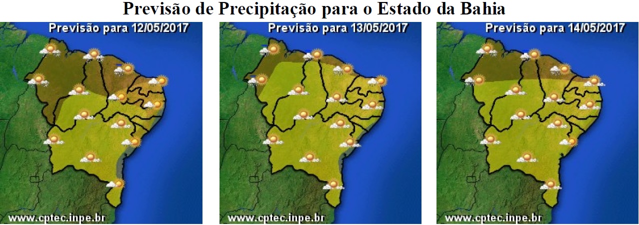 Para os próximos dias, que inclui o final de semana que também se comemora o dia das mães, as condições do tempo na Bahia não deverão ter mudanças significativas, principalmente em relação às chuvas, pois a massa de ar quente e seco continua predominando na maior parte do Estado. Com isso, o predomínio será de céu com poucas nuvens e sem chuvas, sobretudo nas regiões Oeste, São Francisco, Norte, e grande parte da Chapada Diamantina e Sudoeste. Além disso, a permanência desse sistema também está influenciando nas temperaturas, uma vez que, a pouca nebulosidade favorece a elevação das mesmas, com máximas podendo chegar aos 36°C (no período da tarde), enquanto que, durante a madrugada e nas primeiras horas da manhã, há uma significativa redução, com mínimas podendo chegar a 19°C.