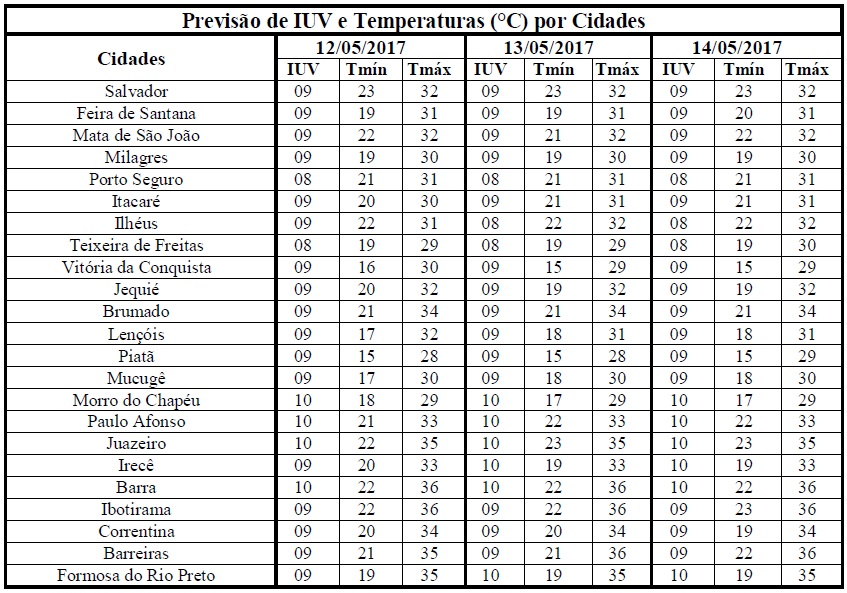 Na segunda metade do outono as características da estação se assemelham as características do inverno, ou seja, com temperaturas mais amenas e chuvas de fraca intensidade, mas de longa duração. Também nesse período, há uma redução na incidência de radiação solar e, consequentemente, dos Índices de Radiação Ultravioleta (IUV's). Ainda assim, estes índices continuam elevados, a exemplo dos que estão previstos para o período entre os dias 12/05 (sexta-feira) e 14/05 (domingo), quando deverão variar de 08 a 10 em todo o Estado. De acordo com a Organização Mundial de Saúde (OMS), estes IUV's fazem parte da categoria de intensidade “Muito Alta”, o que requer cuidados quanto à exposição prolongada à radiação solar, principalmente, nos horários das 10 às 16 horas, quando há maior incidência dessa radiação. Com isso, para minimizar os danos causados a saúde, recomenda-se a utilização de protetor/filtro solar, chapéus, bonés, óculos escuros e roupas leves, etc.