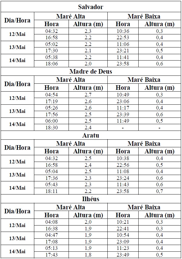 Entre os dias 12 (sexta-feira) e 14/05/2017 (domingo), a maré deverá atingir sua altura máxima no período entre às 04h00min e às 06h00min e entre às 16h00min e às 18h00min, com valores variando de 1,8 a 2,7 metros. Já as alturas mínimas deverão ser registradas no período entre às 10h00min e às 12h00min e entre às 22h00min e às 24h00min, com valores variando de 0,3 a 0,7 metro. As ondas previstas deverão ter agitação de moderada a fraca, com altura máxima podendo chegar aos 2,0 metros.