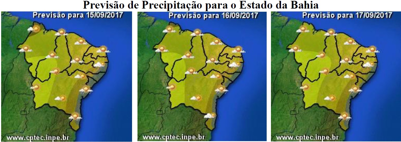 As condições do tempo previstas para a Bahia nesse ultimo final de semana de inverno seguirão sem grandes mudanças. No centro-oeste e norte do Estado ainda é a massa de ar seco que manterá o céu com poucas nuvens e sem chuvas. Além disso, essa massa de ar contribui para deixar as temperaturas elevadas nessa faixa (com máximas podendo chegar aos 36°C em algumas localidades), bem como os índices de umidade relativa reduzidos (podendo atingir valores abaixo de 30%).