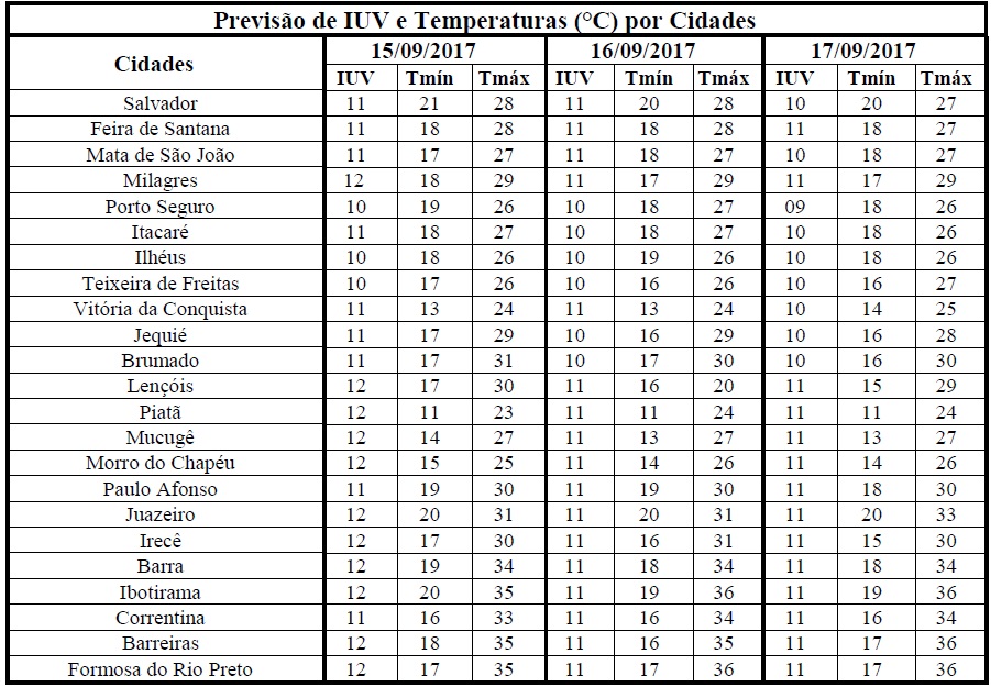 Uma das características do final do inverno e aproximação da primavera é a elevação da Radiação Solar e, consequentemente, dos Índices de Radiação Ultravioleta (IUV). Tal condição pode ser observada entre os dias 15/09 (sexta-feira) e 17/09 (domingo), quando os IUV deverão variar de 10 a 12. Segundo a Organização Mundial de Saúde (OMS) tais Índices estão classificados nas categorias “Muito Alta e Extrema”, o que requer cuidados quanto à exposição prolongada à radiação solar. Com isso, recomenda-se usar protetor/filtro solar, chapéus, bonés, óculos escuros e roupas leves, sobretudo nos horários das 10 às 16 horas. Esses cuidados são essenciais, pois poderão minimizar danos à saúde, já que nesse intervalo de tempo os efeitos nocivos dos raios solares são maiores.