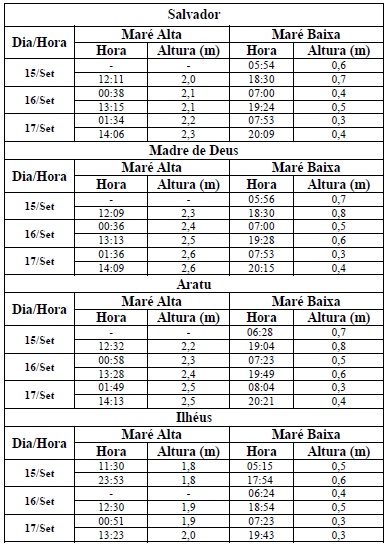 Entre os dias 15/09 (sexta-feira) e 17/09 (domingo), a maré deverá atingir sua altura máxima no período entre as 00h e as 02h e entre as 12h e as 14h com valores variando de 2,0 a 2,5 metros. Já as alturas mínimas deverão ser registradas no período entre as 06h e as 08h e entre as 18h e as 20h, com valores variando de 0,3 a 0,8 metro. As ondas previstas deverão ter agitação de moderada a forte, com altura máxima podendo chegar aos 3,0 metros.