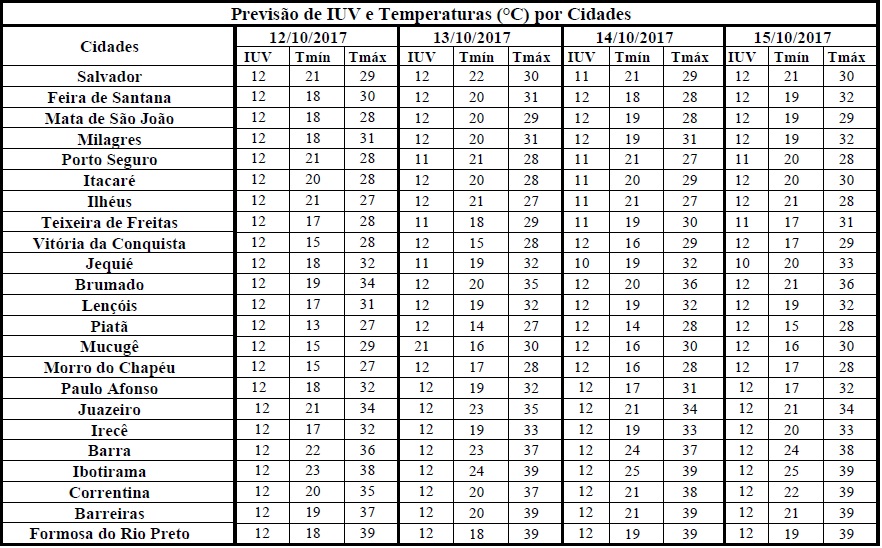 Uma das características do início da primavera é a elevação da Radiação Solar e, consequentemente dos Índices de Radiação Ultravioleta (IUV). Tal condição pode ser observada entre os dias 12 (quinta-feira) e 15/10 (domingo), quando os IUVs ainda deverão predominar de 11 a 12. Segundo a Organização Mundial de Saúde (OMS) tais Índices estão classificados na categoria “Extrema”, o que requer cuidados quanto à exposição prolongada à radiação solar. Com isso, recomenda-se usar protetor/filtro solar, chapéus, bonés, óculos escuros e roupas leves, sobretudo nos horários das 10 às 16 horas. Esses cuidados são essenciais, pois poderão minimizar danos à saúde já que nesse intervalo de tempo os efeitos nocivos dos raios solares são maiores.