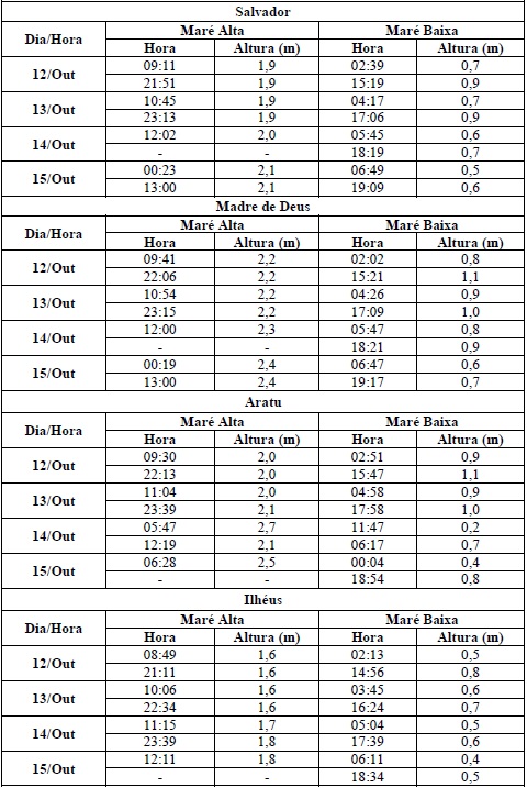Entre os dias 12/10 (quinta-feira) e 15/10 (domingo), a maré deverá atingir sua altura máxima no período entre as 09h00min e as 12h00min e entre as 21h00min e a 00h00min, com valores variando de 1,6 a 2,7 metros. Já as alturas mínimas deverão ser registradas no período entre as 03h00min e as 06h00min e entre as 15h00min e as 18h00min, com valores variando de 0,2 a 1,1 metros. As ondas previstas deverão ter agitação fraca, com altura máxima podendo chegar aos 1,5 metros.