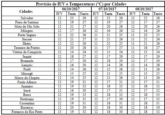 Uma das características do início da primavera é a elevação da Radiação Solar e, consequentemente dos Índices de Radiação Ultravioleta (IUV). Tal condição pode ser observada entre os dias 06 (sexta-feira) e 08/10 (domingo), quando os IUVs deverão predominar de 11 a 12. Segundo a Organização Mundial de Saúde (OMS) tais Índices estão classificados nas categorias “Extrema”, o que requer cuidados quanto à exposição prolongada à radiação solar. Com isso, recomenda-se usar protetor/filtro solar, chapéus, bonés, óculos escuros e roupas leves, sobretudo nos horários das 10 às 16 horas. Esses cuidados são essenciais, pois poderão minimizar danos à saúde já que nesse intervalo de tempo os efeitos nocivos dos raios solares são maiores.