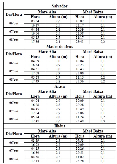 Entre os dias 06/10 (sexta-feira) e 08/10 (domingo), a maré deverá atingir sua altura máxima no período entre as 04h00min e as 06h00min e entre as 16h00min e a 18h00min, com valores variando de 2,1 a 3,0 metros. Já as alturas mínimas deverão ser registradas no período entre as 10h00min e as 12h00min e entre as 22h00min e as 00h00min, com valores variando de 0,1 a 0,3 metros. As ondas previstas deverão ter agitação moderada a fraca, com altura máxima podendo chegar aos 2,0 metros.