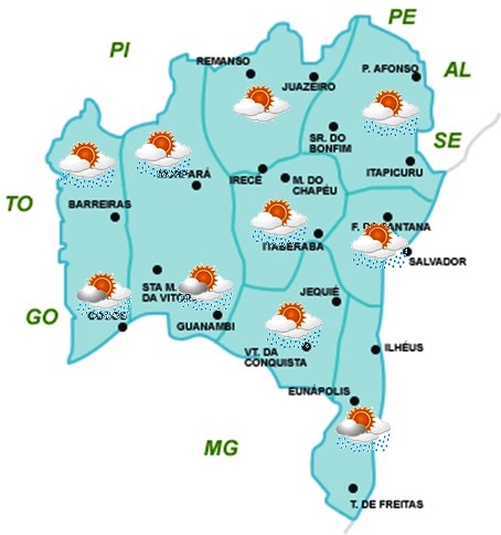 Para as demais regiões da Bahia, o predomínio é de céu parcialmente nublado a claro, com possibilidade de chuvas fracas em áreas isoladas na maior parte do período. No entanto, a partir do dia 17/12 (domingo) os ventos úmidos vindos do Oceano Atlântico deverão contribuir para o aumento da nebulosidade e das chances de ocorrer chuvas em algumas localidades do Recôncavo e Nordeste baiano.