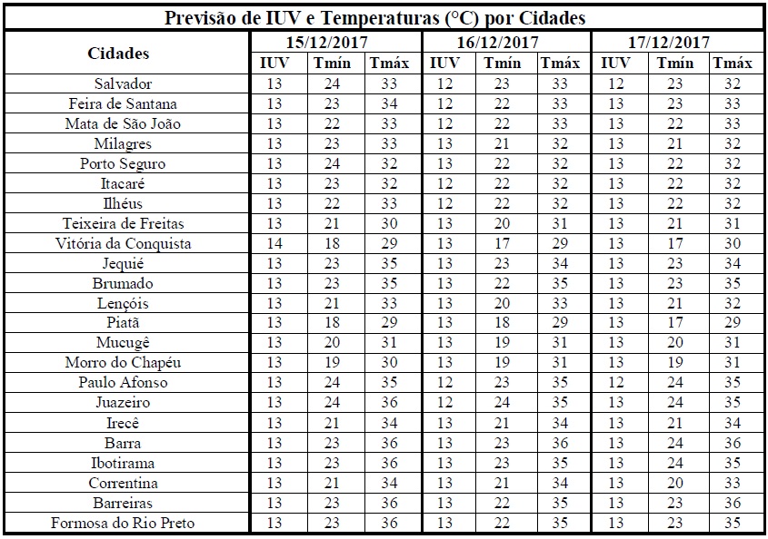 Uma das características da segunda metade da estação da primavera e início do verão é o aumento na incidência de radiação solar e, consequentemente, na elevação dos Índices de Radiação Ultravioleta (IUV) no estado da Bahia. Esta condição pode ser observada no período entre os dias 15/12 (sexta-feira) e 17/12 (domingo), quando os IUVs deverão variar de 12 a 14. De acordo a Organização Mundial de Saúde (OMS) tais Índices estão classificados na categoria “Extrema”, o que requer cuidados quanto à exposição prolongada à radiação solar. Com isso, recomenda-se usar protetor/filtro solar, chapéus, bonés, óculos escuros e roupas leves, sobretudo nos horários das 10 às 16 horas. Esses cuidados são essenciais, pois poderão minimizar danos à saúde já que nesse intervalo de tempo os efeitos nocivos dos raios solares são maiores.