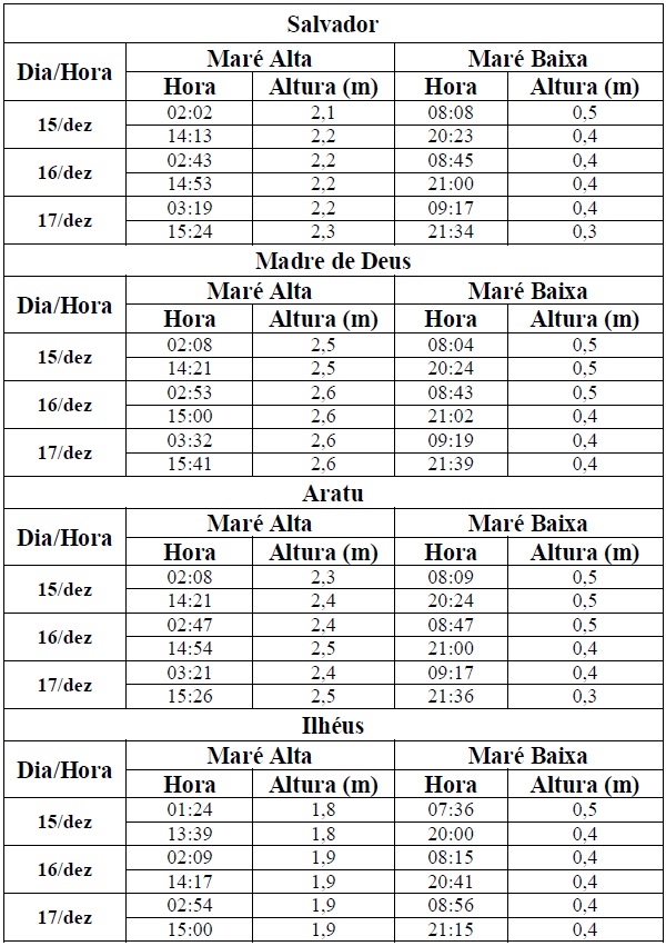 Entre os dias 15/12 (sexta-feira) e 17/12 (domingo), a maré deverá atingir sua altura máxima no período entre à 01h30min e às 03h00min e entre às 13h30min e às 15h30min, com valores variando de 1,8 a 2,6 metros. Já as alturas mínimas deverão ser registradas no período entre as 07h30min e às 09h30min e entre às 19h30min e às 21h30min, com valores variando de 0,3 a 0,5 metros. As ondas previstas deverão ter agitação fraca, com altura máxima podendo chegar aos 2,0 metros.
