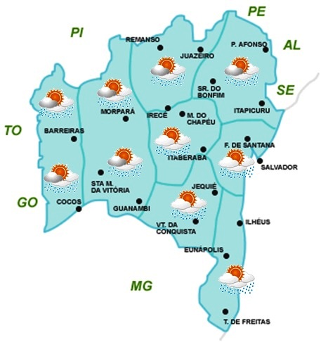 Para este final de semana, as condições do tempo na Bahia estão indicando instabilidade em grande parte do Estado. Na faixa leste a umidade vinda do Oceano Atlântico deverá favorecer a ocorrência de chuvas fracas a moderadas. Além disso, as temperaturas continuarão elevadas com máximas podendo chegar aos 34°C.