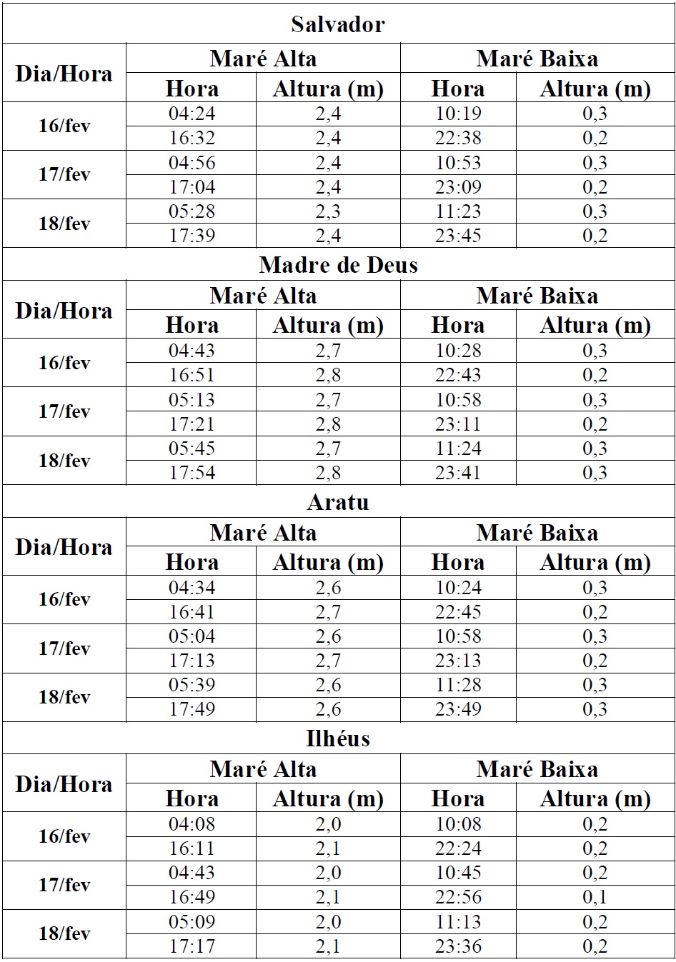 Entre os dias 16/02 (sexta-feira) e 18/02/18 (domingo), a maré deverá atingir sua altura máxima no período entre às 04h e às 06h e entre às 16h e às 18h, com valores variando de 2,0 a 2,8 metros. Já as alturas mínimas deverão ser registradas no período entre às 10h e às 12h e entre as 22h e às 24h, com valores variando de 0,1 a 0,3 metro. Quanto a previsão de ondas, estas deverão ter agitação fraca e com altura máxima podendo chegar a 1,5 metro.