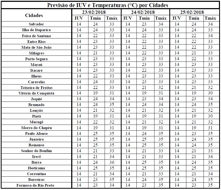 Uma das características do verão é o aumento na incidência de radiação solar e, consequentemente, na elevação dos Índices de Radiação Ultravioleta (IUV) no estado da Bahia. Esta condição pode ser observada no período entre os dias 23/02 (sexta-feira) e 25/02/18 (domingo), quando os IUVs deverão ficar em torno de 14. De acordo com a Organização Mundial de Saúde (OMS), estes Índices estão classificados na categoria “Extrema”, o que requer cuidados quanto à exposição prolongada à radiação solar, a exemplo do uso de protetor/filtro solar, chapéus, bonés, óculos escuros e roupas leves, principalmente nos horários entre as 10 e as 16 horas. Esses cuidados são essenciais, pois poderão minimizar danos à saúde, já que nesse intervalo de tempo os efeitos nocivos dos raios solares são maiores.