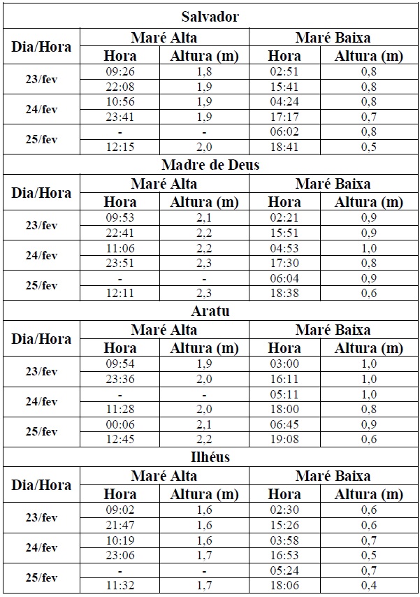 Entre os dias 23/02 (sexta-feira) e 25/02/18 (domingo), a maré deverá atingir sua altura máxima no período entre às 09h e às 13h e entre às 21h e à 01h do dia seguinte, com valores variando de 1,6 a 2,3 metros. Já as alturas mínimas deverão ser registradas no período entre às 03h e às 07h e entre as 15h e às 19h, com valores variando de 0,4 a 1,0 metro. Quanto à previsão de ondas, estas deverão ter agitação fraca e com altura máxima podendo chegar a 1,5 metro.