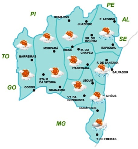 A umidade vinda do Oceano Atlântico permanece contribuindo para ocorrência de chuvas na faixa leste da Bahia. Assim, no Recôncavo (incluindo a cidade de Salvador), Nordeste e Sul da Bahia, a previsão é de céu nublado a parcialmente nublado com chuvas em algumas áreas, principalmente no período da noite. Na região Sul não se descarta a possibilidade de chuvas moderadas. No restante do Estado o predomínio será de céu com pouca nebulosidade.