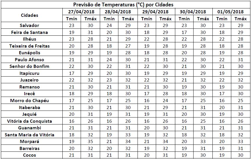 Previsão para o dia 27/04/2018