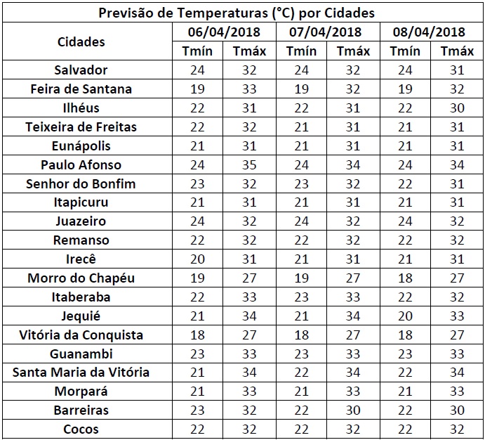 Tempo instável com possibilidade de chuvas fracas em toda faixa litorânea do Estado. Na faixa central da Bahia, o tempo seguirá estável, ou seja, com sol entre nuvens e poucas chances de ocorrer chuvas. Para o extremo oeste baiano, há possibilidade de que as chuvas ocorram de forma fraca e isolada.