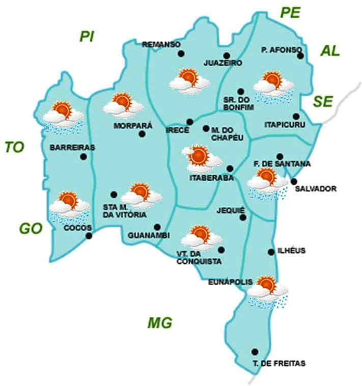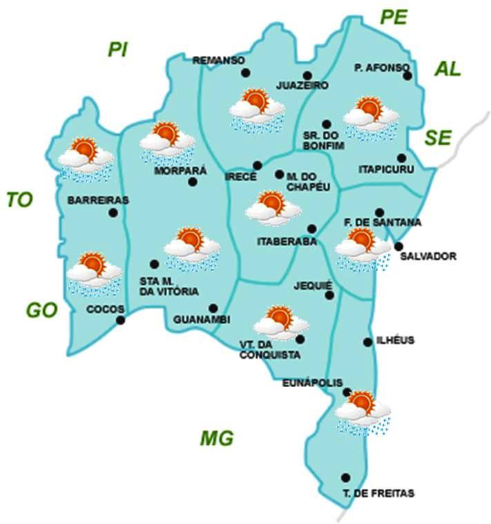 Chapada Diamantina e Sudoeste, há somente previsão de chuvas fracas e isoladas.