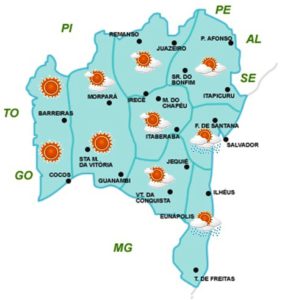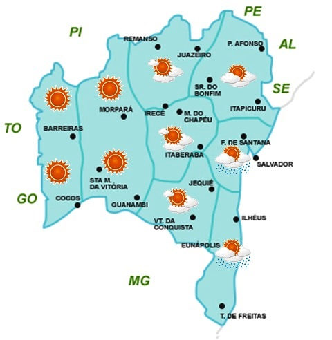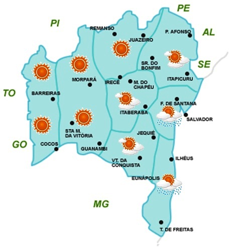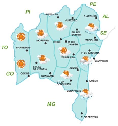Nebulosidade variável com chuvas fracas na faixa leste do Estado. No Sudoeste e parte da Chapada Diamantina também há chances de chuvas fracas e em áreas isoladas. No restante do Estado, o predomínio será de céu com pouca nebulosidade e sem chuva.