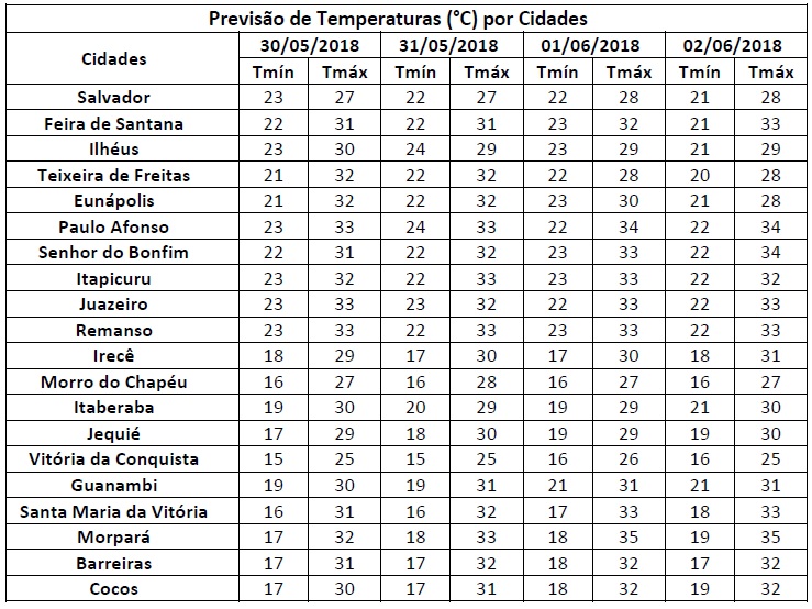 Céu parcialmente nublado com chances de chuvas fracas e de curta duração na faixa litorânea. No restante do Estado, céu parcialmente nublado a claro na maior parte do período. É esperada uma elevação das temperaturas na maioria das regiões, com máximas podendo chegar aos 35°C em algumas localidades do centro-oeste baiano.