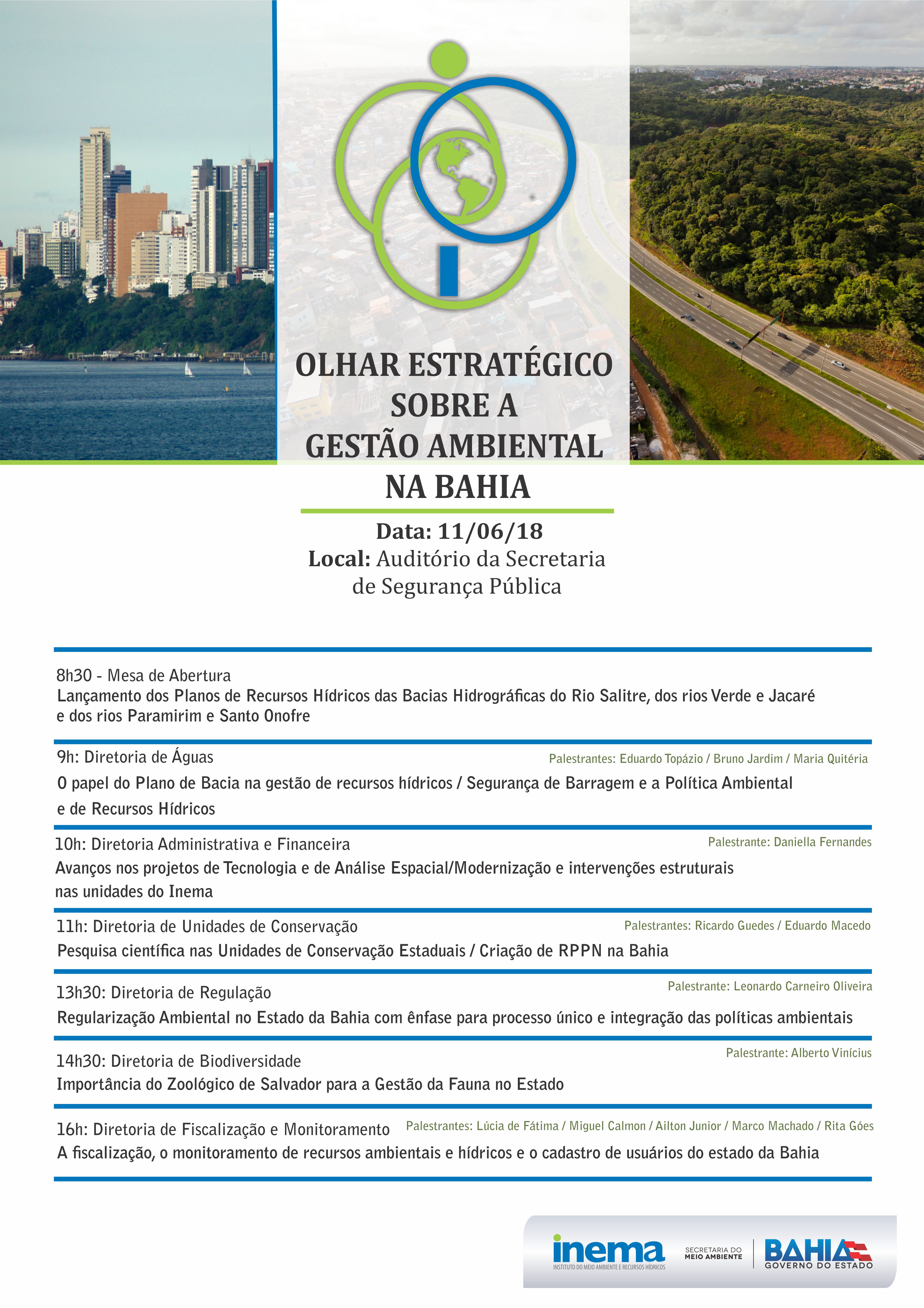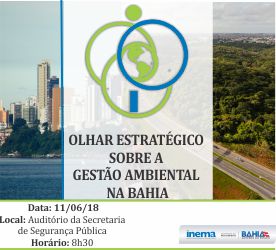 Encerrando a semana de comemorações ao Dia Mundial do Meio Ambiente (05 de junho), o Instituto do Meio Ambiente e Recursos Hídricos (Inema) realiza, no dia 11/06(segunda-feira), das 8h30 às 17h, o seminário Olhar Estratégico sobre a Gestão Ambiental na Bahia, que acontece no auditório do Centro de Operações e Inteligência de Segurança Pública, no Centro Administrativo da Bahia. Na oportunidade serão lançados os Planos de Recursos Hídricos das Bacias Hidrográficas do Rio Salitre, dos rios Verde e Jacaré e dos rios Paramirim e Santo Onofre.