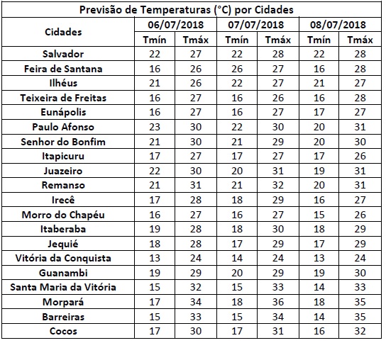 A massa de ar seco manterá a nebulosidade reduzida em todo o interior do Estado. Esta condição favorece a uma significativa amplitude térmica em algumas áreas, a exemplo do Oeste e São Francisco, onde as temperaturas deverão oscilar entre mínimas de 14°C e máximas de até 36°C. Na Chapada Diamantina e Sudoeste, as mínimas poderão ficar abaixo dos 13° em algumas localidades, o que poderá contribuir para a formação de neblina em áreas de baixada. Já na faixa litorânea, incluindo a grande Salvador, a umidade vinda do mar manterá o céu parcialmente nublado com chances de chuvas fracas e de curta duração, principalmente durante a noite e início da manhã. As temperaturas na grande Salvador deverão variar entre mínimas de 22°C e máximas de 28°C.