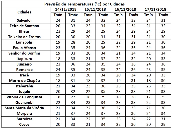 No oeste baiano são esperadas chuvas em forma de pancadas, podendo vir acompanhadas de descargas elétricas. No sul do Estado também poderão ocorrer eventos de chuvas, porém de curta duração e fraca intensidade. No restante da Bahia, o predomínio será de céu com poucas nuvens e temperaturas elevadas.